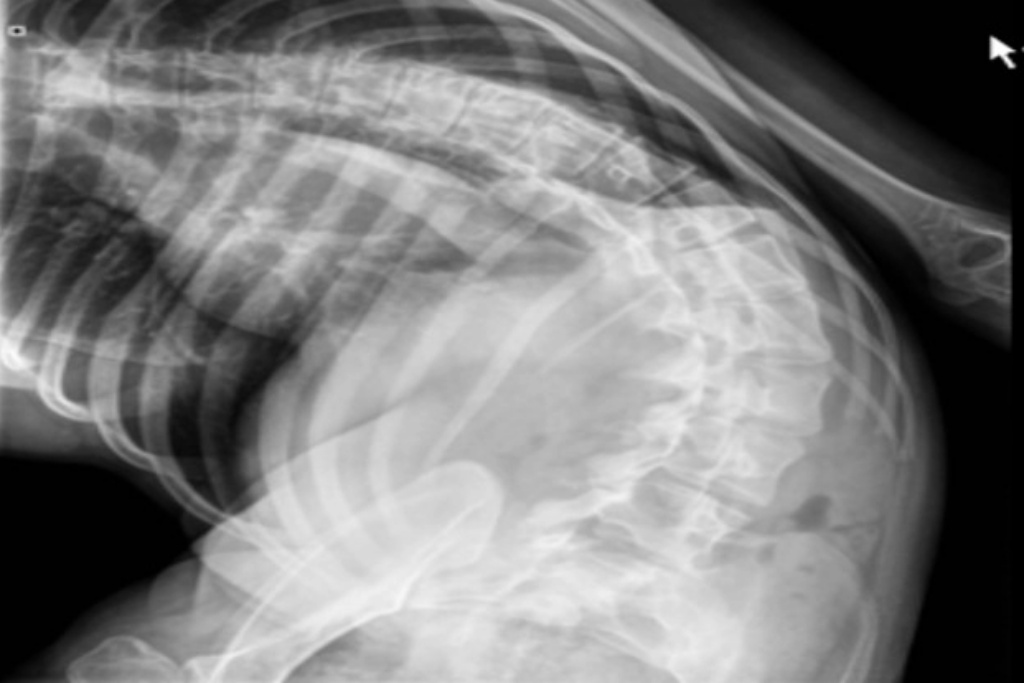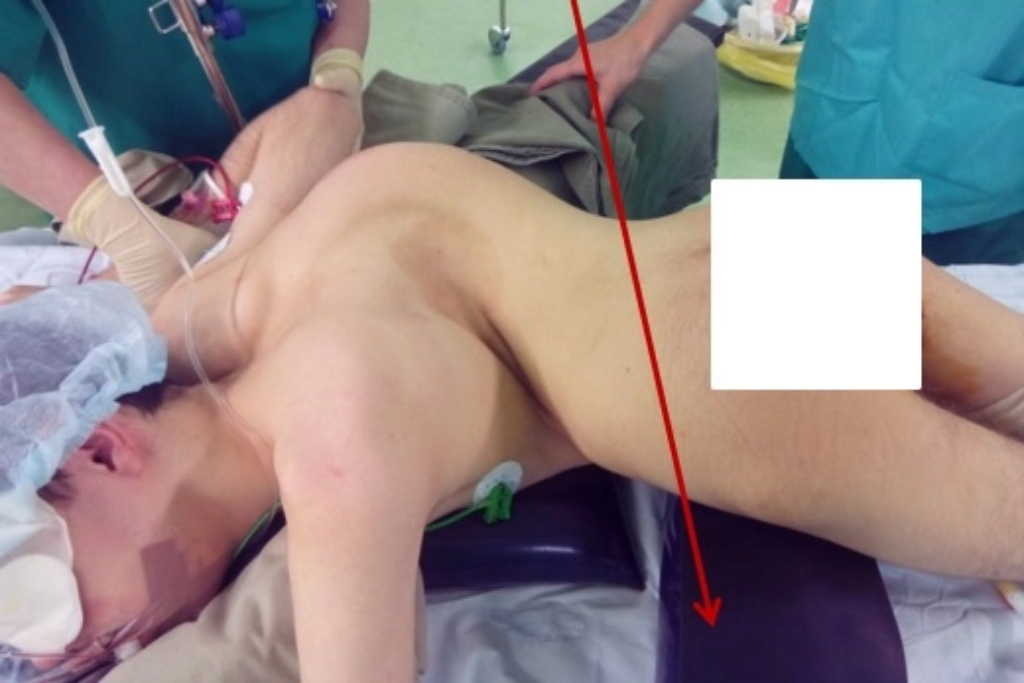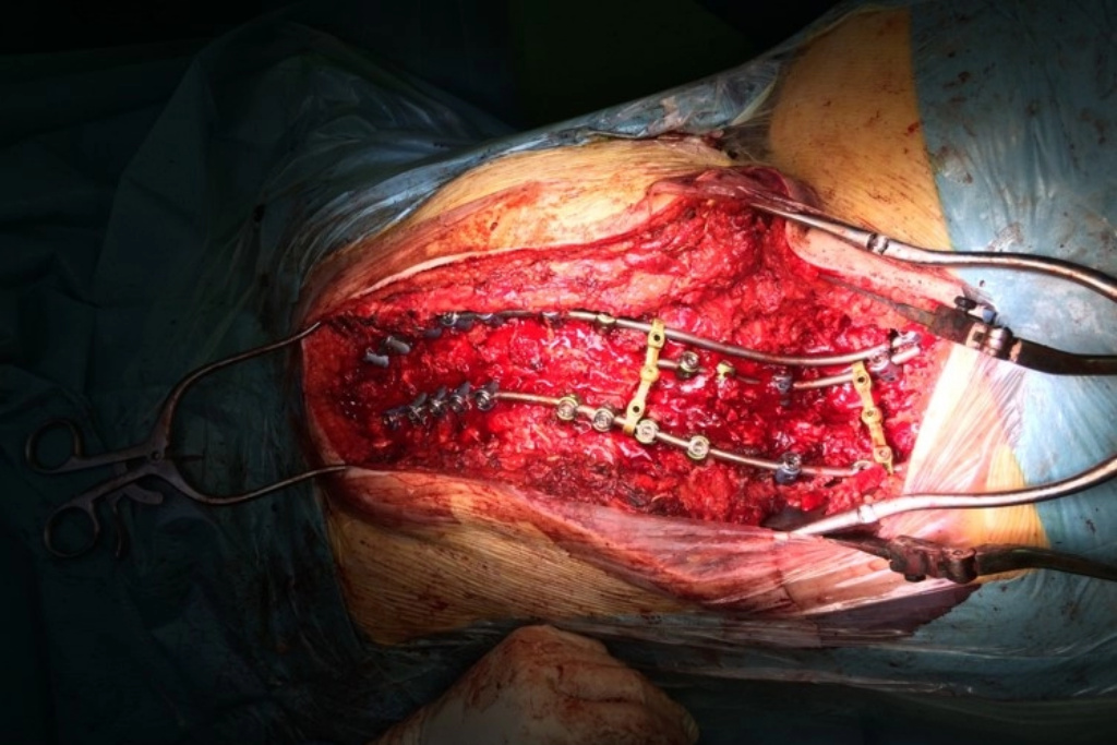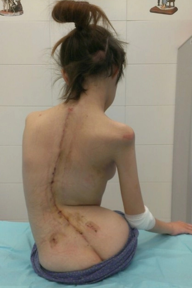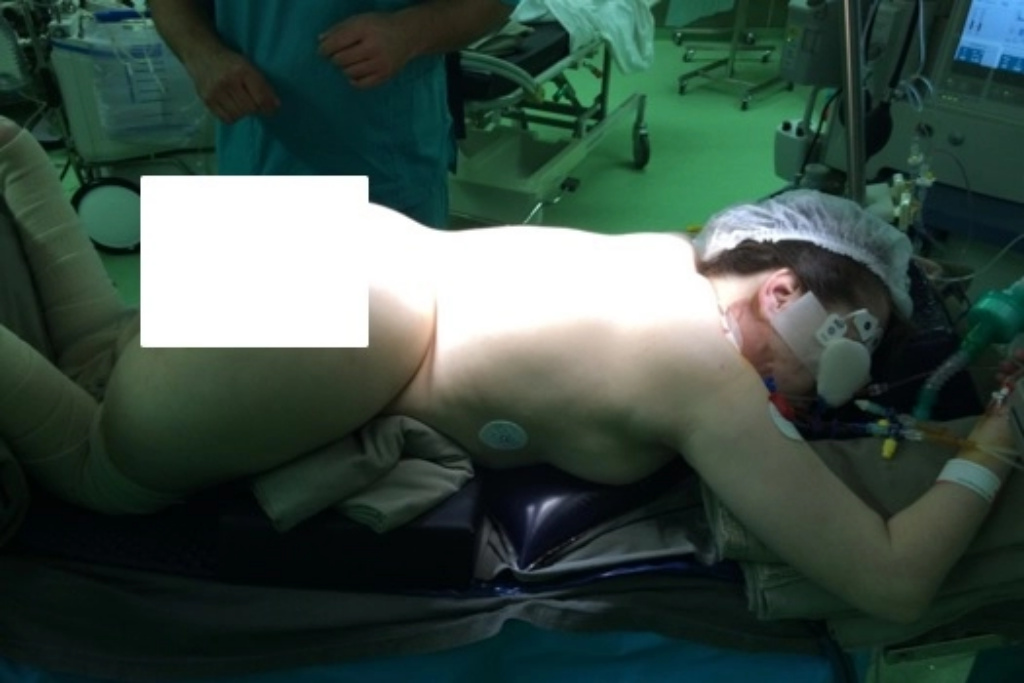 Operace pacientky s dekompenzovanou skoliózou. Jde o stav, kdy se tělo již nedokáže samo vyrovnat s vychýlením páteře. Je to mnohem závažnější než kompenzovaná skolióza a může vést k bolestem zad, asymetrii těla, únavě a dalším problémům, které vyžadují léčbu fyzioterapií, korzetoterapií nebo v nejtěžších případech i chirurgickým řešením.